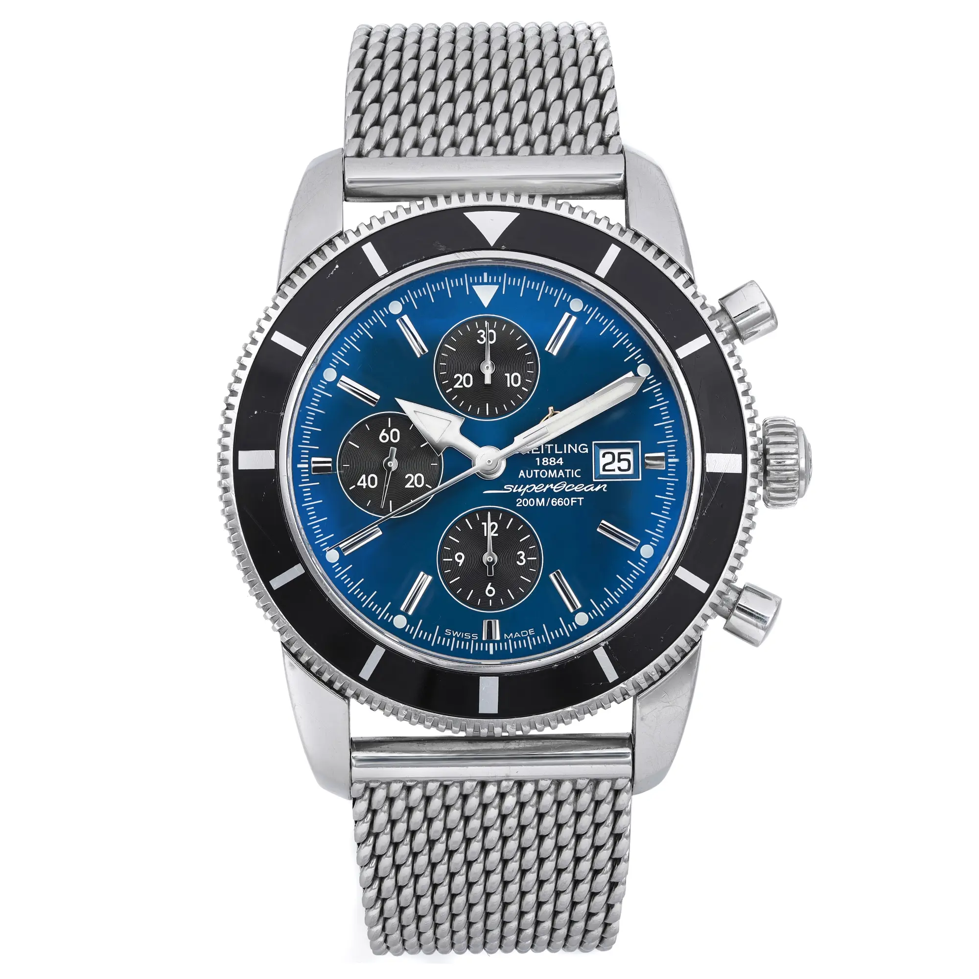 Features: Chronograph, Date Indicator, Luminous Hands, Rotating Bezel, Sapphire Crystal, Small Seconds Subdial, Screwdown Crown, Self-Winding, Swiss Made, Swiss Movement, Water-Resistant