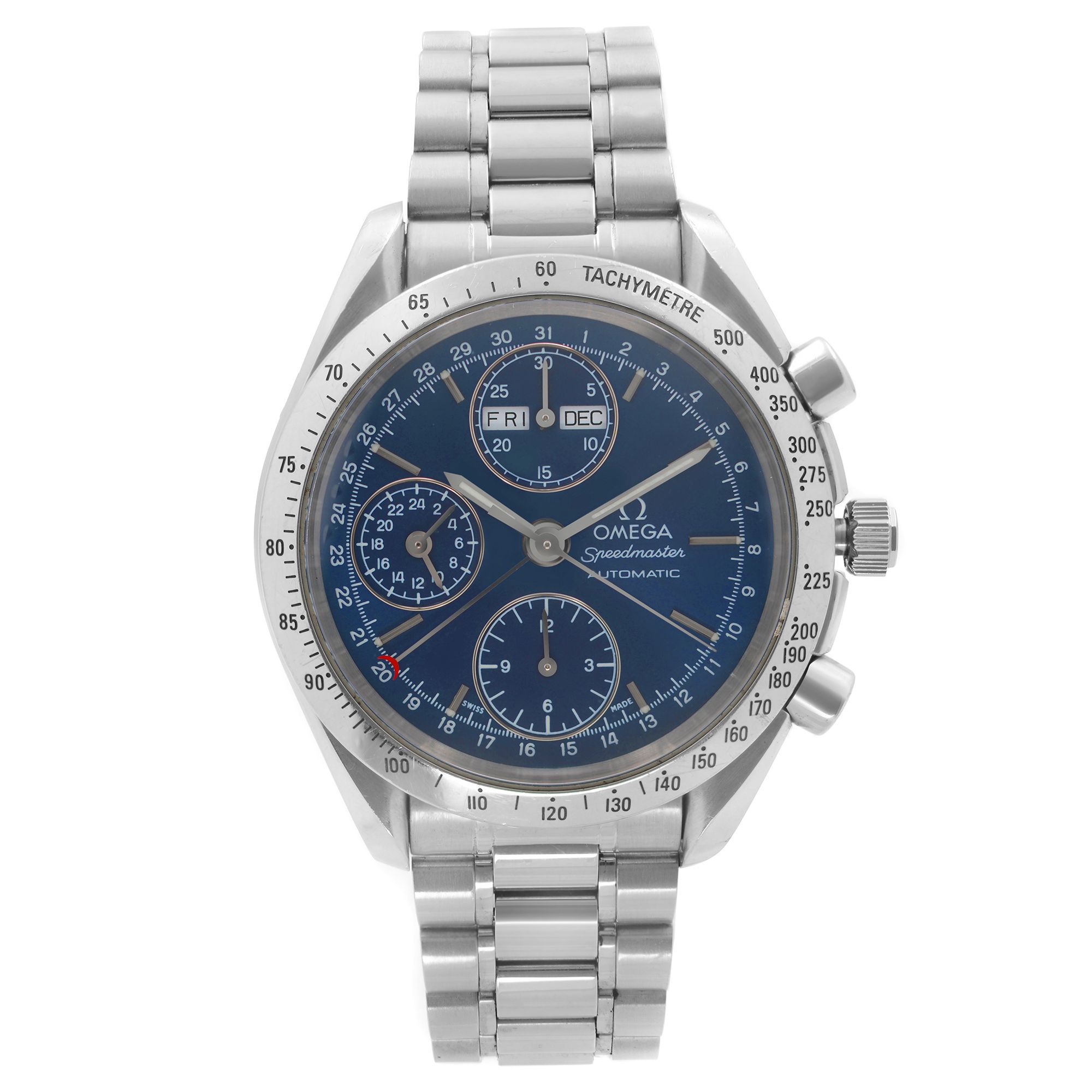 Pre Owned Omega Speedmaster Steel Chronograph Blue Dial Automatic Mens Watch 3521.80. This Timepiece Features: Stainless Steel Case & Bracelet, Fixed Stainless Steel Bezel with Tachymeter, Blue Dial with Luminous Silver-Tone Hands and Index Hour Markers. Date Displayed on the Outer Rim of the Dial. Chronograph - 3 Sub-Dials Displaying: 30 minutes, 12 hours and 24 hours. Day of the Week & Month indicator inside 30 minute Sub-Dial. No Original Box and Papers are Included. Comes with Chronostore Presentation Box and Authenticity Card. Covered by 1-year Chronostore Warranty. Worldwide Shipment with a 30-day Hassle-Free Return Available.